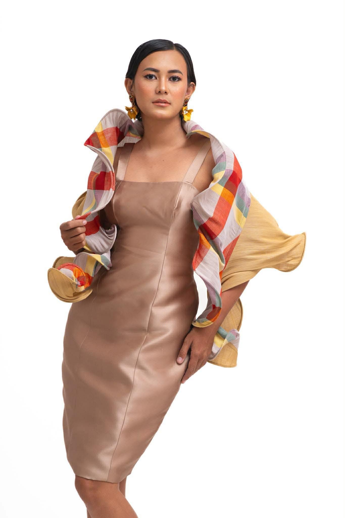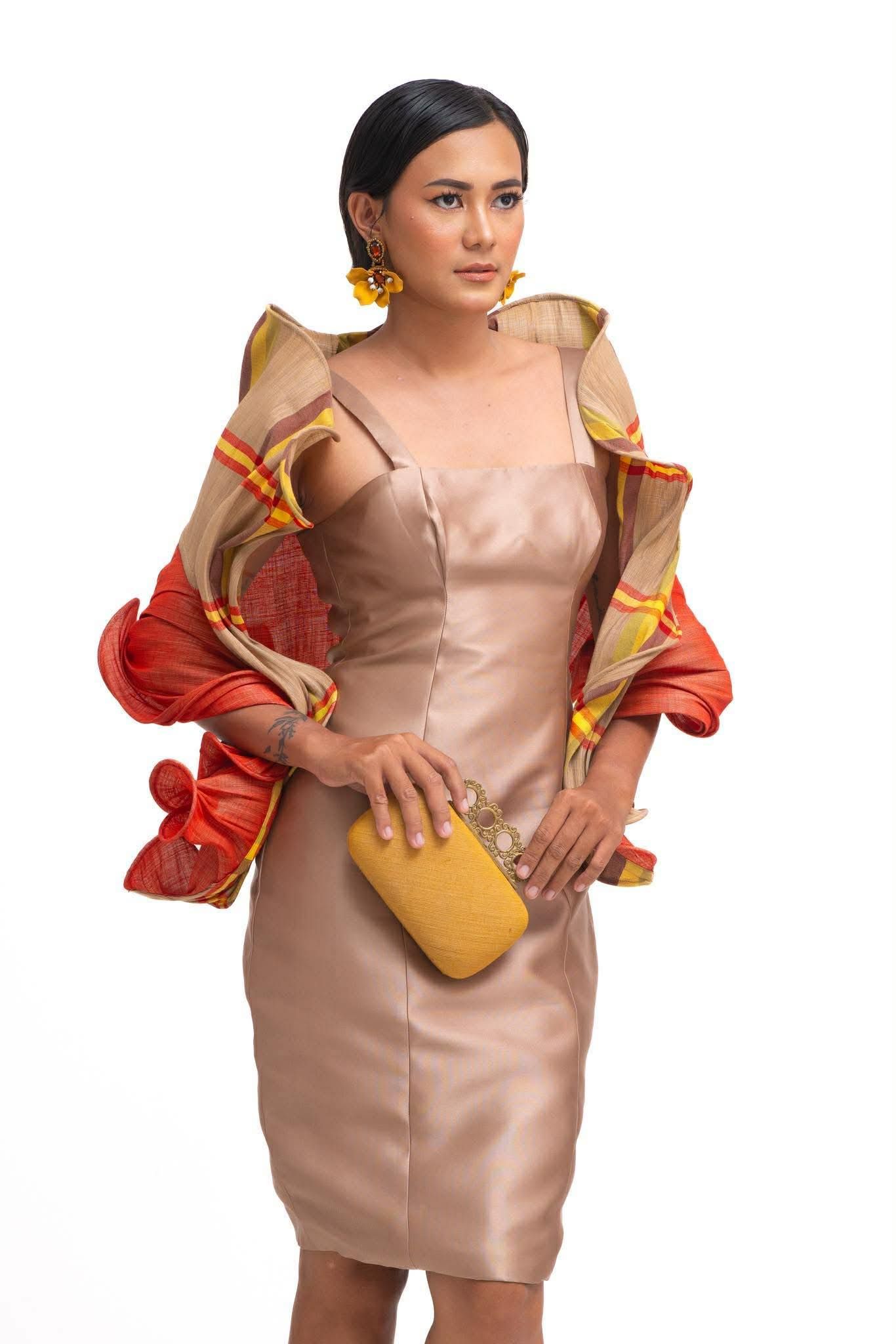 The Salimbay shawl designed by Joy Soo mirrors the fluid elegance of birds soaring through the sky, made of handwoven Musa Fabric woven by the persons deprived of liberty in Davao del Norte. It captures the sweeping motions the term "salimbay" evokes.